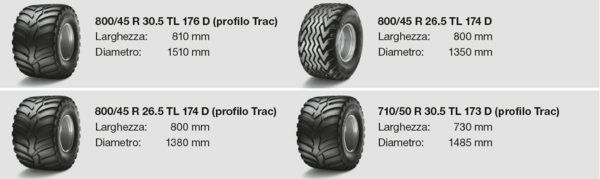 Varianti pneumatici: Anche con il gruppo tridem è possibile scegliere gli pneumatici che più si adattano alle esigenze. Gli larghi pneumatici rotolano bene, preservano la cotica erbosa e con impronte minime.
