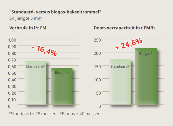 Bij korte haksellengtes levert het gebruik van de KRONE biogastrommel met 40 messen vergeleken met de MaxFlow hakseltrommel met 28 messen een bijna 25% hogere doorvoercapaciteit op. Hierbij kan het brandstofverbruik tot ca. 16% per ton gehakseld oogstgoed worden verminderd.