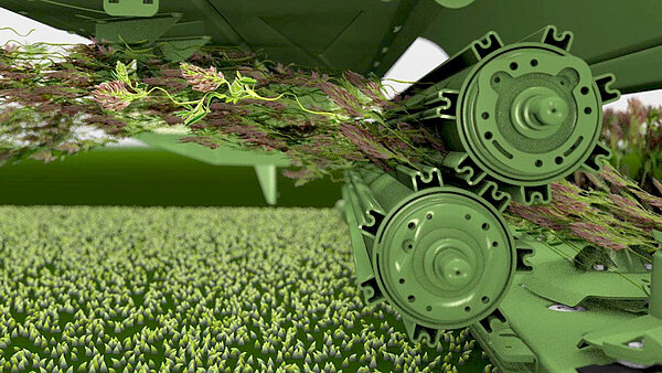De actieve aandrijving van de bovenste wals van de M-Rolls vindt synchroon plaats via een aandrijving aan de buitenkant van de maaibalk vanaf de onderste wals. Daarmee bent u ook in de zwaarste voerbestanden optimaal uitgerust.