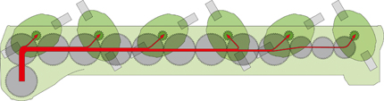 Оригинал: разработанный KRONE планетарный привод в косилочном брусе и успешно эксплуатируемый на протяжении десятилетий во всем мире: большие цилиндрические шестерни с зубьями до 59 штук передают усилие главного привода до конца косилочного бруса. По причине их большого диаметра они вращаются медленнее и больше зубьев входят в зацепление с большим количеством соседних цилиндрических шестерен. Эта конструкция подкупает плавностью хода, лучшей передачей усилия и высоким сроком службы. Предшествующие вспомогательные приводы приводят в действие только по одному соответствующему косилочному диску и подвергаются лишь незначительным нагрузкам.