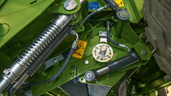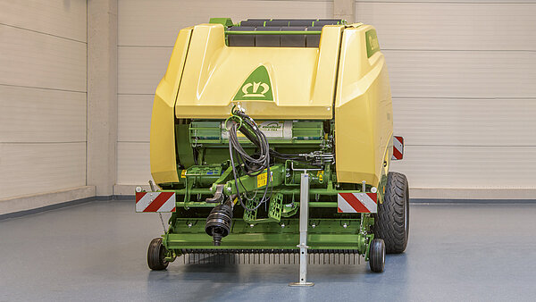 VariPack серийно оснащен одной механической опорной стойкой. Это обеспечивает безопасное положение машины, когда она не используется. Чтобы без проблем подбирать даже большие валки, опорная стойка дополнительно отводится в сторону.