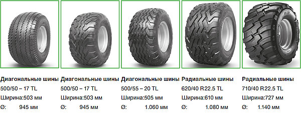Для любых условий эксплуатации имеются соответствующие шины. Широкие шины имеют в частности преимущество на податливом грунте, где они по причине большей опорной поверхности меньше уплотняют почву и имеют более легкий ход.