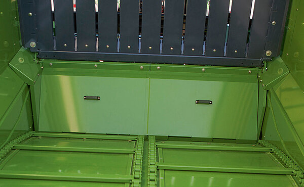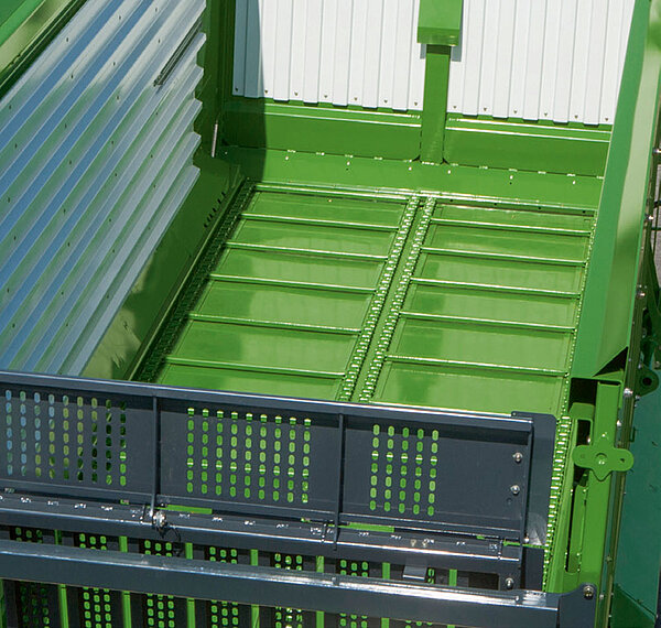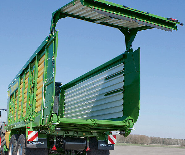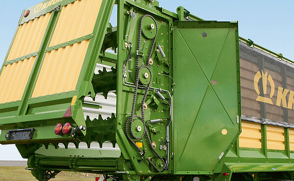 Без дозирующих вальцов: Самозагружающиеся прицепы двойного назначения без дозирующих вальцов имеют повышенную производительность. Огромная пропускная производительность при открытом заднем борту, откидываемый назад подвижный борт и высокопроизводительный, двойной донный скребковый транспортер сокращают время выгрузки. Остается больше времени для уплотнения массы на траншеи, в результате чего растет качество силосной/ сенажной массы.