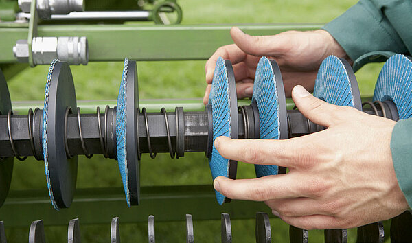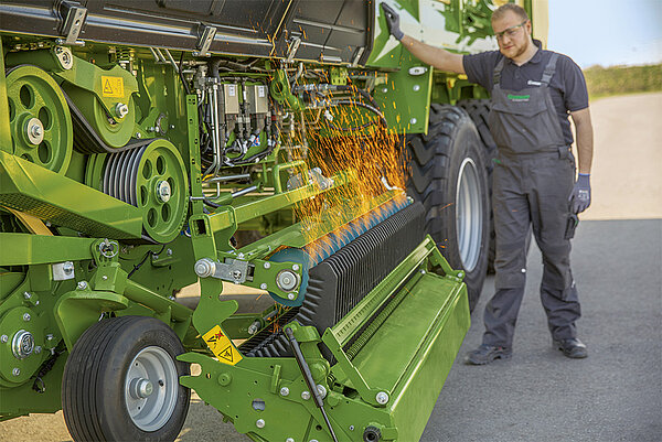 Эксклюзив от KRONE: Шлифовальные круги автоматического, входящего в дополнительную комплектацию, затачивающего устройства размещены на перемещаемомо в сторону вала с гидравлическим приводом. Все рабочие процессы по заточке с 48 ножами производятся автоматически всего лишь одним нажатием кнопки.