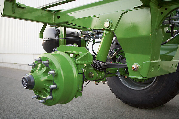 Неизменяемая регулировка: Большой компенсационный ход обеспечивает равномерную нагрузку на передние и задние колеса. Превосходная способность к преодолению подъемов оси облегчает переезд по силосным/ сенажным траншеям с крутым подъемом.