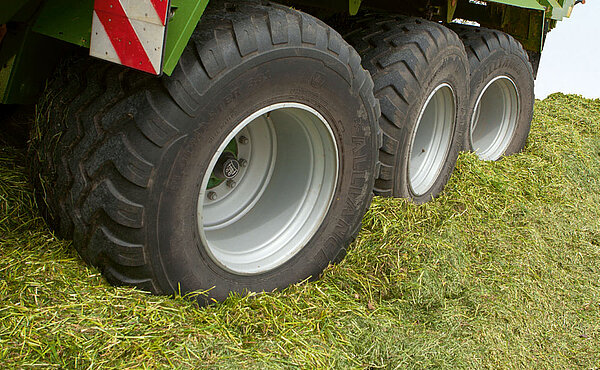 С принудительно управляемыми колесами сохраняется луговая дернина и шины при прохождении поворотов. Снимается нагрузка с тандемной или трехосной ходовой части, а прицеп буксируется легче. Благодаря электронике механизатор может легче производить маневрирование, активно управлять при движении по склону или краю силосной/ сенажной траншеи и изменять положение управляемых осей, так что прицеп управляется против направления заноса.