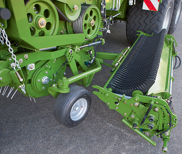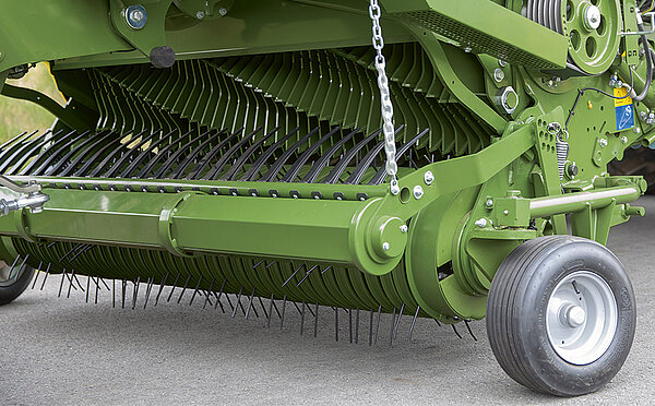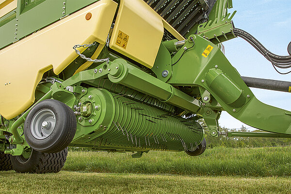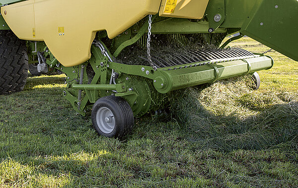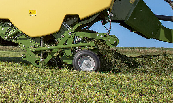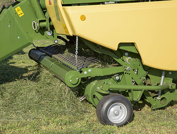 Задние копирующие колеса: Копирующие колеса сзади подборщика, входящие в дополнительную комплектацию, обеспечивают лучший характер передвижения и чистый подбор кормовой массы на мягком грунте. Копирующие колеса сзади подборщика, входящие в дополнительную комплектацию, обеспечивают лучший характер передвижения и чистый подбор кормовой массы на мягком грунте.