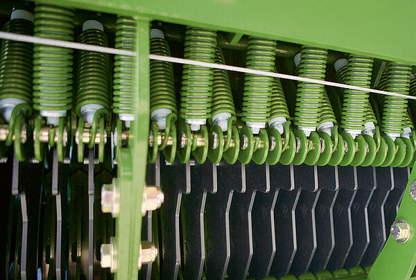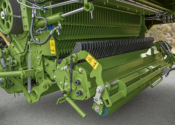 Точное резание с защемлением обеспечивается за счет использования сверхшироких конвейерных опор в сочетании с плотным расположением ножей и накладок. При этом ширина накладок варьируется в пределах от 17 до 22 мм в зависимости от режущего аппарата. Децентрализованное расположение наконечников накладок создает оптимальное срезающее воздействие на ноже, что обеспечивает бережное и экономное подбирание убираемой культуры. Таким образом предотвращается раздавливание.
