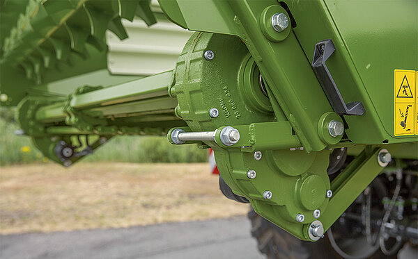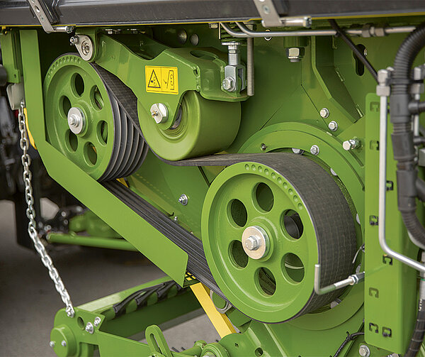 Уникальная концепция привода KRONE Powerbelt в сочетании с расположенным в роторе планетарным редуктором понижение частоты вращения с главного привода на режущий и подающий ротор. Эта техническая особенность отличается узкой конструкцией, позволяющей максимальную ширину ротора. Привод впечатляет высокой производительностью, чрезвычайной плавностью хода, малым износом и минимальным обслуживанием. С широким ремнем возможна передача мощности до 430 л.с. в приводном механизме. Предохранительная кулачковая муфта в главном карданном валу обеспечивает безопасность всего приводного механизма при крутящем моменте до 3000 Нм.