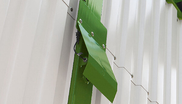 Автоматическое концевое отключение донного скребкового транспортёра: При полном прицепе собранная зеленая масса давит на дозирующий валец и смещает его назад в кулисной направляющей. Датчик перемещения останавливает приводной механизм донного скребкового транспортёра. Дозирующие вальцы могут работать без сбоев.