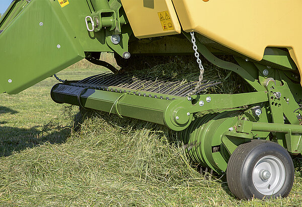 Без управления проще: Изюминкой этого подборщика без направляющей беговой дорожки является особая конструкция скребков. Он обеспечивает непрерывный поток зеленой массы при опускании пальцев.
