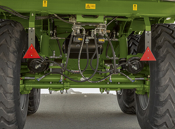 Высочайшая устойчивость при движении: При неровностях гидравлическая жидкость нагнетается от переднего к заднему цилиндру или наоборот. По причине раздельных (с обеих сторон) гидравлических контуров оси конструкция сохраняет устойчивость при боковом раскачивании и по всей ширине находится параллельно земле.