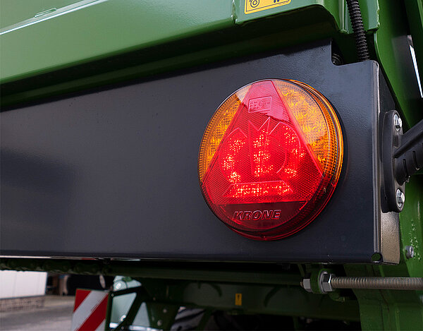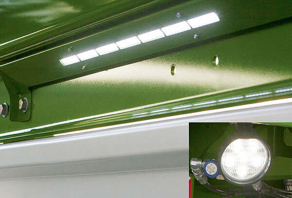Две светодиодные ленты с обеих сторон обеспечивают опти- мальную освещенность в зоне забора зеленой массы. Они обеспечивают достаточную освещенность перед и за подборщиком и, благодаря рассеянному свету, создают приятную рабочую атмосферу, не ослепляя.