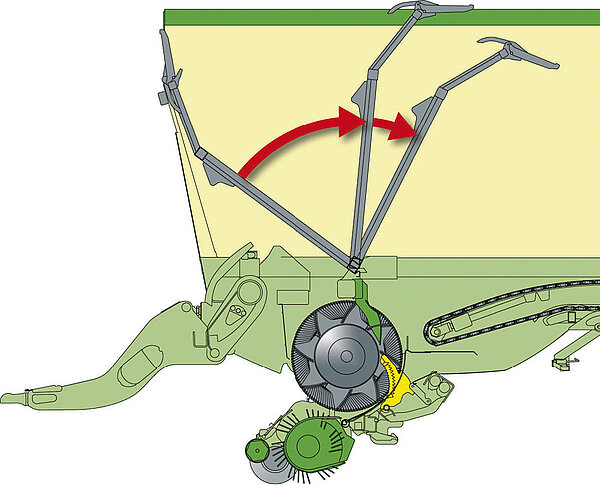 Тройная мощь: С тремя закрытыми дозирующими вальцами и регулируемым задним бортом Вы укладываете еще более однородный шлейф. V-образно размещенеые зубья распределяют кормовую массу по всей ширине. Более высокая скорость вращения нижнего дозирующего вальца приводит к еще большему сокращению времени, затрачиваемого на разгрузку.