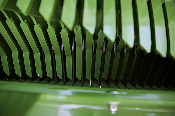 Режет как ножницами. Этому способствует небольшое расстояние между широкими накладками на пальцы и отдельно защищенными ножами. 48 ножей обеспечивают превосходное короткое измельчение. С помощью механизма центрального переключения ножей Вы можете свободно выбирать режимы резки и в одно мгновение устанавливать необходимую длину резки.