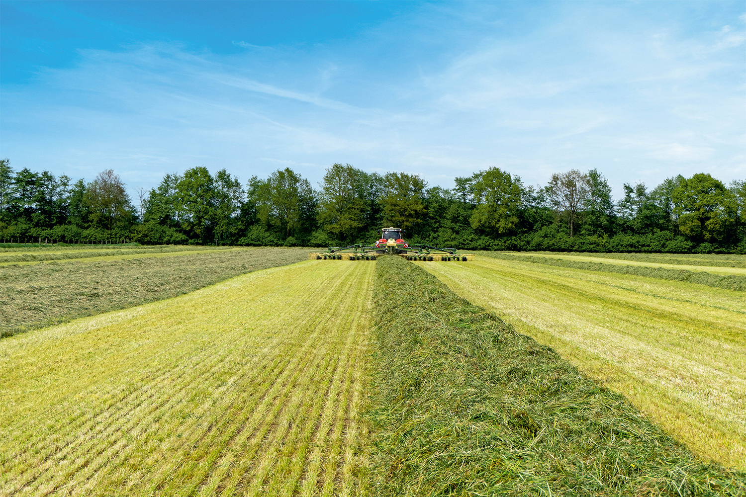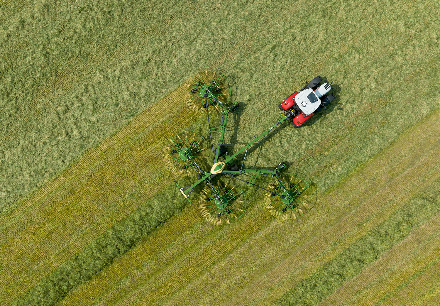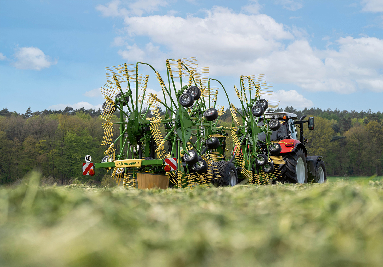 По 15 граблин на каждом из четырех роторов и по пять зубьев на граблинах задних роторов гарантируют полную уборку массы, в том числе на высокой скорости движения. Зубья KRONE «Lift» поднимают с поля всю растительную массу без остатков даже на высокой рабочей скорости, убедительно снижая риск попадания загрязнений в массу. Отличительными особенностями полностью механического привода KRONE Easy-Line являются эффективная передача усилия и увеличение скорости вращения передних роторов на 25% по сравнению с задними роторами. Таким образом обеспечивается оптимальный поток массы под машиной и формирование ровных коробчатых валков без скручивания. Благодаря гидравлическому управлению консолей задних роторов ширина валков может варьироваться от 1,40 м до 2,90 м. Это обеспечивает оптимальную равномерную загрузку последующей цепочки кормозаготовительной техники – пресс-подборщиков, прицепов или комбайнов.